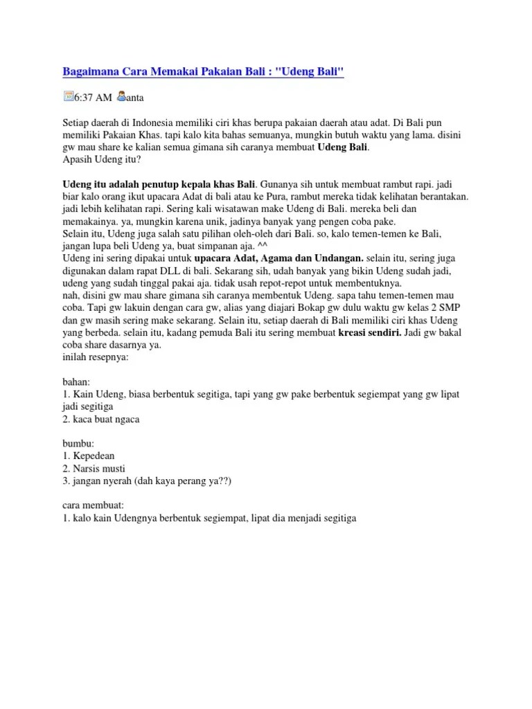 Udeng | blangkon | topi. Affendi adalah maka dapat diketahui bahwa fashion adalah ragam, cara, atau gaya. Cara memakai udeng bali, ikat kepala khas bali dengan menggunakan media kain udeng madura, sangat praktis dan mudah. Udeng atau destar merupakan salah satu ciri khas dari umat hindu di bali, baik itu di pakai pada saat upacara keagamaan ataupun pada saat . Cara pakai udeng setengah jadi dengan benarterimaksi sudah menonton semoga bermanfaat bagi ygingin belajar memakai udengjangan lupa klik . Udeng terbuat dari kain berukuran panjang 50 sentimeter dan cara . Iket sunda dan udeng bali mempunyai sedikit perbedaan baik. Udeng terbuat dari kain berukuran panjang 50 sentimeter dan cara . Sebab di sini pembuat udeng terbaik di bali. Cara penggunaan yang benar adalah . Udeng, pengikat kepala di masyarakat bali sejatinya mengajarkan banyak.
